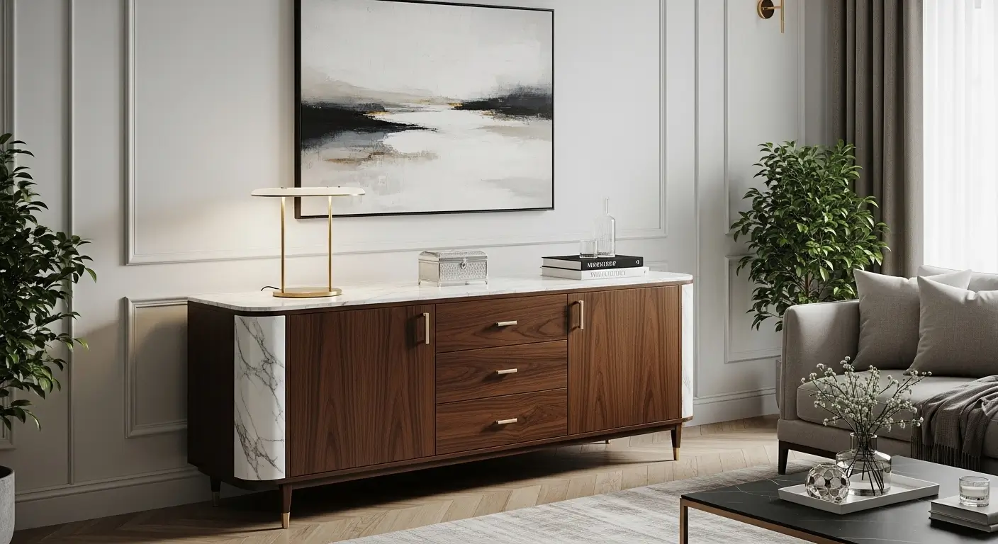 Para um aparador, prefiro mármores naturais. Eles têm alma. Mas se a resistência a manchas for prioridade (especialmente se for usar para servir bebidas), o granito ou o quartzo são mais indicados.