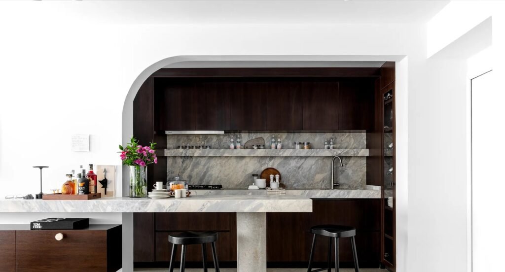 O mármore dolomítico Ayla reveste bancadas, península e prateleiras da cozinha. Além do caráter estético, o material une a marcenaria de tonalidade amadeirada escura às superfícies claras de paredes, piso e teto. A península, que avança até a sala, funciona como apoio de um lado e, do outro, como bar e rack para a televisão.