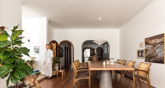 Portas em arco, pé-direito alto e linhas orgânicas foram mantidos para preservar a identidade histórica do apartamento. Segundo a equipe, o desafio foi equilibrar conservação de elementos marcantes com soluções contemporâneas voltadas ao cotidiano dos moradores.