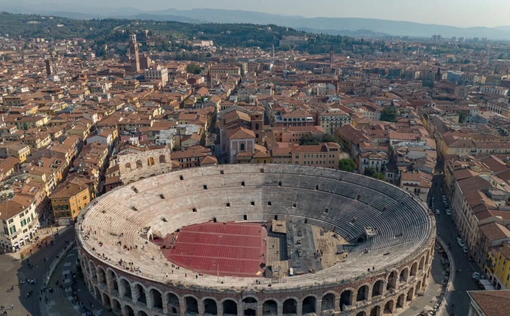 Construída na primeira metade do século I d.C., a arena foi erguida em mármore Rosso Ammonitico, que confere à estrutura tonalidades brancas e rosadas. O formato oval mede 140 m por 100 m e atinge 31 m de altura.