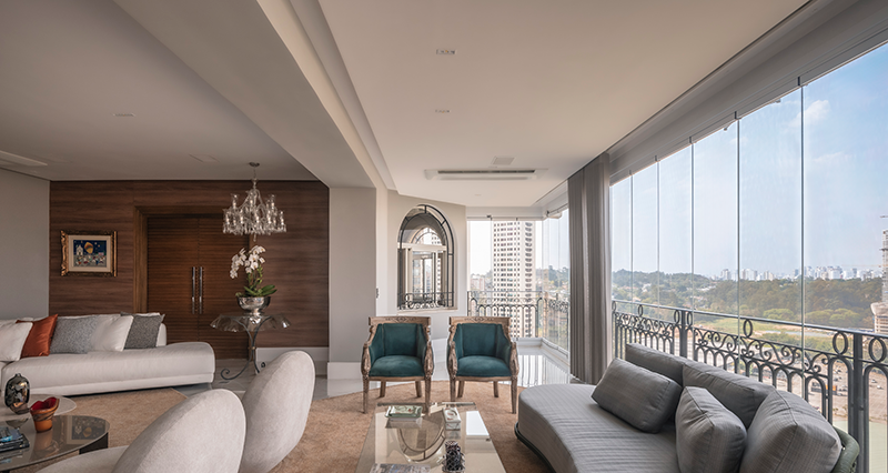 A arquiteta Eliana Tucci concluiu a reforma de um apartamento de 300 m² no bairro Panamby, na zona sul de São Paulo, com foco na integração total da área social. O projeto atendeu ao pedido dos proprietários de unir a ampla sacada ao living e, ao mesmo tempo, preservar o conforto acústico.