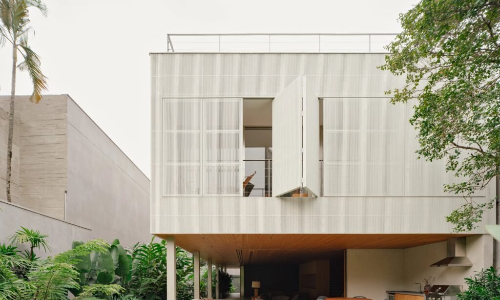 A fachada voltada para a rua permanece totalmente fechada no térreo; no piso superior, brises garantem a privacidade. No interior, jardins densos criam a sensação de “oásis urbano”, segundo as profissionais responsáveis.