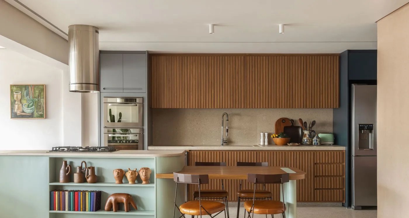 O ponto central do projeto é a junção entre cozinha e churrasqueira em uma única bancada. A solução combina marcenaria em verde-menta com lâminas de madeira, criando um espaço socializado, com banquetas em uma extremidade e área para refeições rápidas na outra. “Unimos tudo numa só peça para organizar a cocção e reforçar o uso coletivo”, explica o arquiteto Mauricio Arruda.