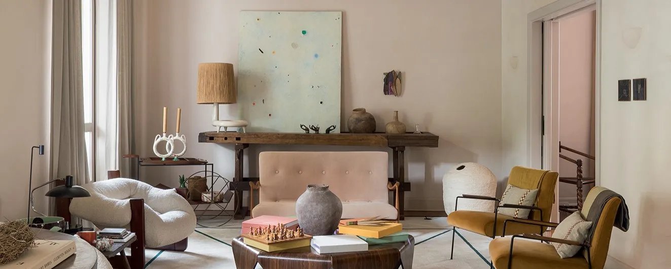 Móveis brasileiros garimpados de designers como Sergio Rodrigues, Jorge Zalszupin e Joaquim Tenreiro dividem espaço com criações contemporâneas, objetos herdados e achados internacionais. No terraço, o paisagismo assinado por Flávia Tiraboschi compõe o cenário de celebrações, incluindo a festa de 45 anos de Roxana, realizada no ano passado com culinária tailandesa.