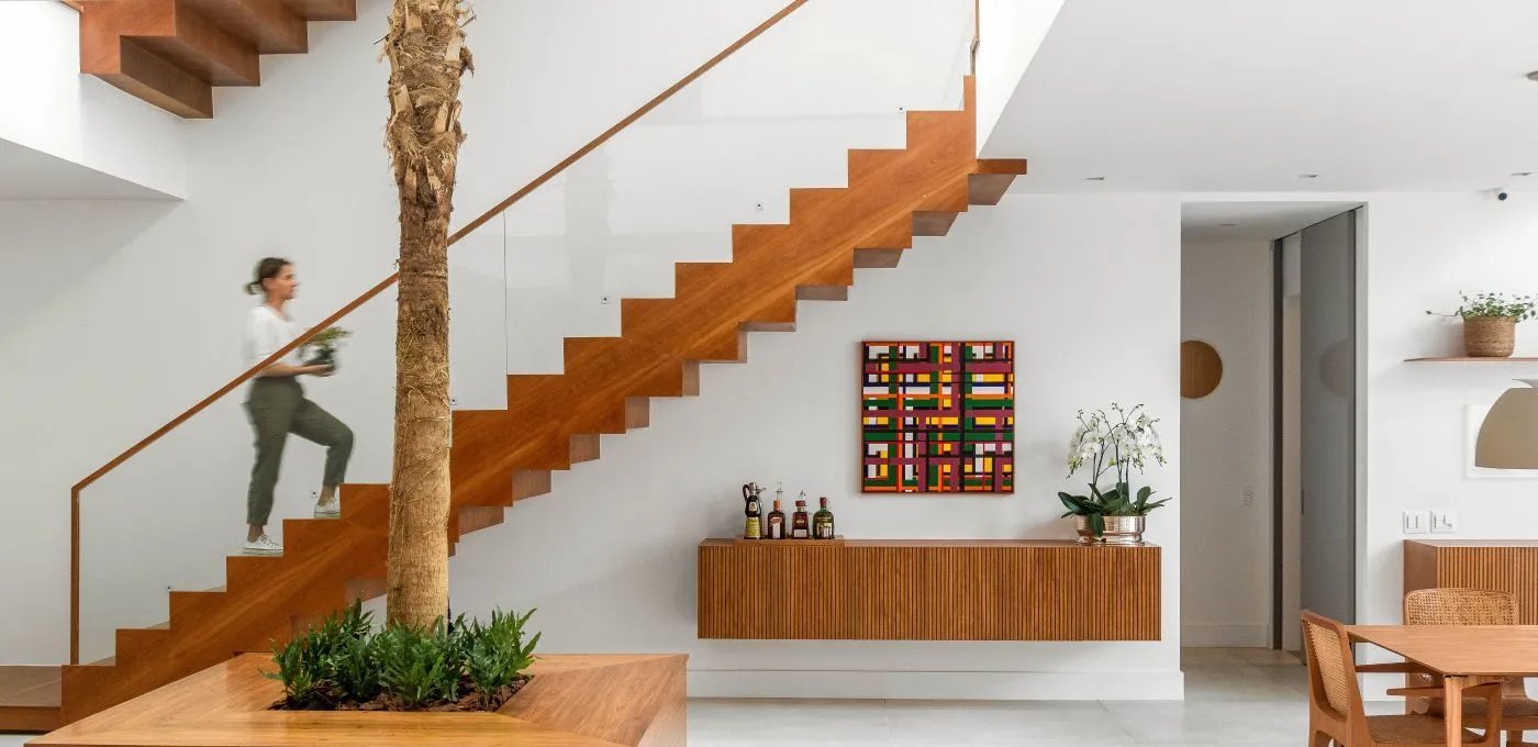 A arquiteta Ana Rozenblit, do escritório Spaço Interior, explica que a decisão deve levar em conta se a escada está em área interna ou externa, o estilo do imóvel e a integração com guarda-corpo e corrimão. “Todos os elementos precisam conversar”, resume.