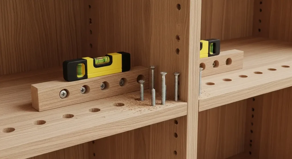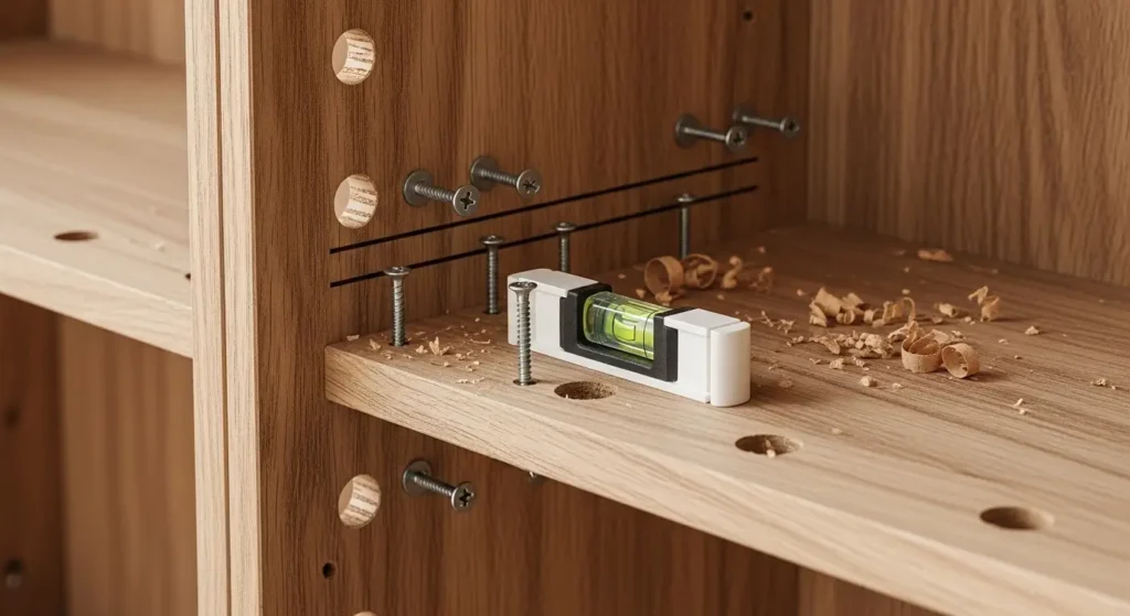 1. Pinos e Prateleiras Fixas: Para as laterais e divisórias internas, usei cola branca e parafusos. Nada de furar a olho; fiz uma furação guiada com gabarito para garantir o esquadro perfeito.