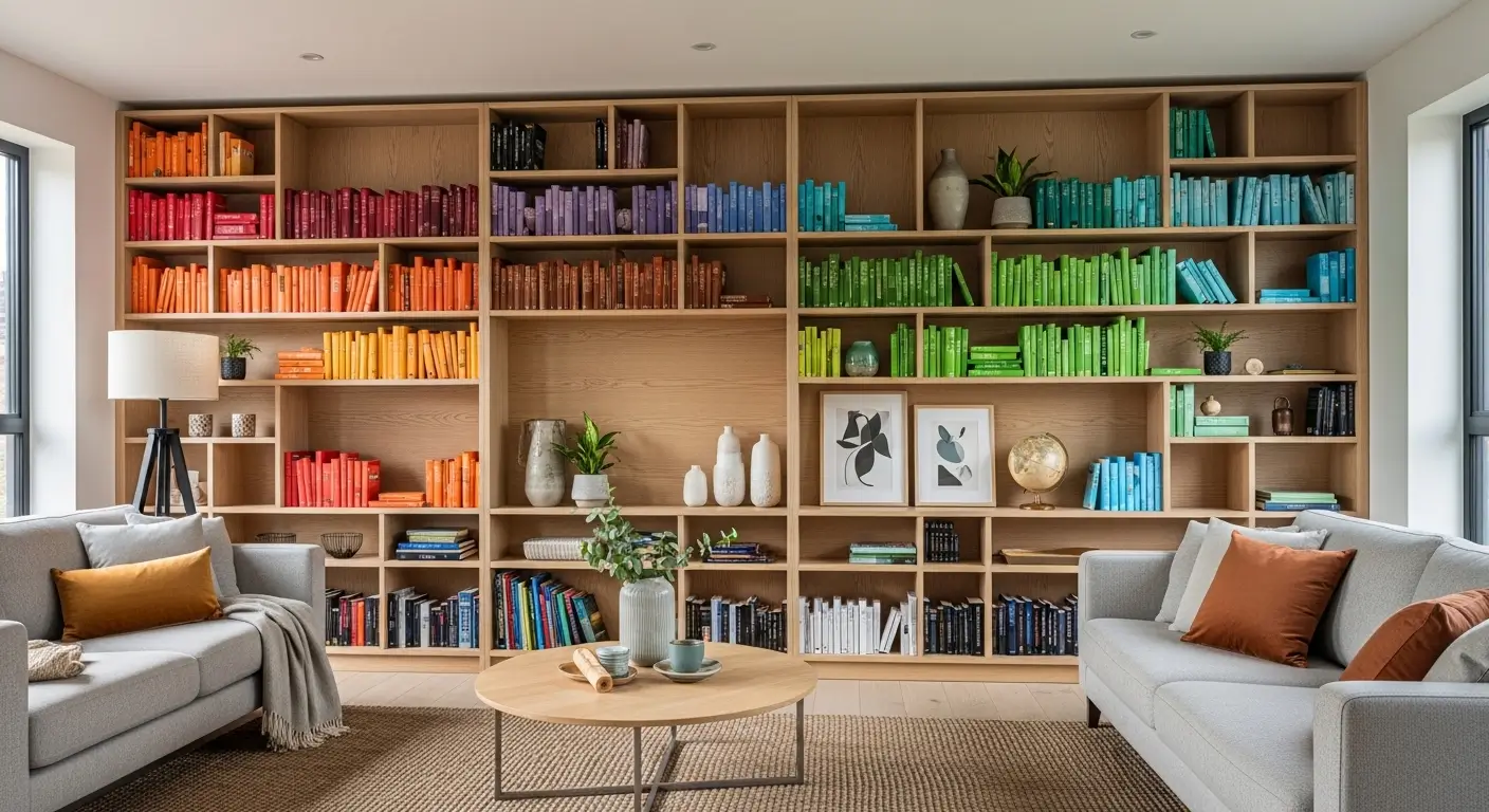 Quanto à organização, escolha o que faz sentido para você: por cor (visual impactante), por gênero (prático) ou por altura (visual limpo).