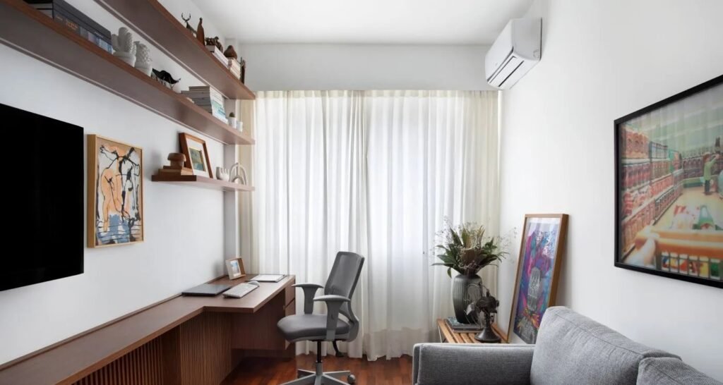 Para apartamentos compactos, a regra é evitar peças superdimensionadas. “Uma mesa grande demais prejudica a circulação e causa sensação de aperto”, observa Bolsi. A mesa precisa comportar notebook, monitor extra, livros e demais itens usados diariamente, completa Lívia Leite, do Estúdio Maré. Móveis sob medida, prateleiras leves e soluções verticais ajudam a organizar sem sobrecarregar o visual.
