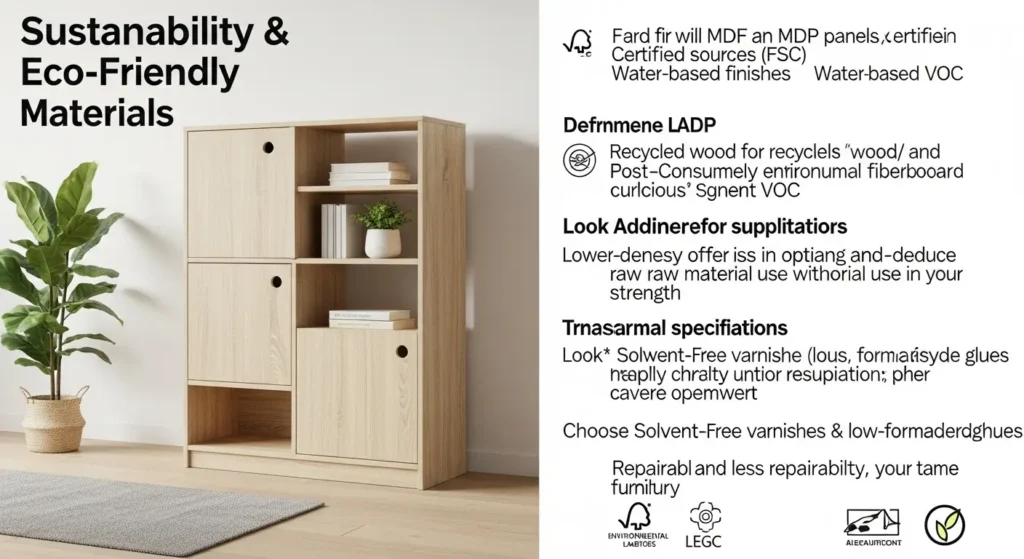 Você encontrará painéis de MDF e MDP de origem certificada (FSC) e acabamentos à base de água que reduzem VOCs. A procura por madeiras recicladas e painéis de fibras pós-consumo cresce entre fabricantes conscientes.