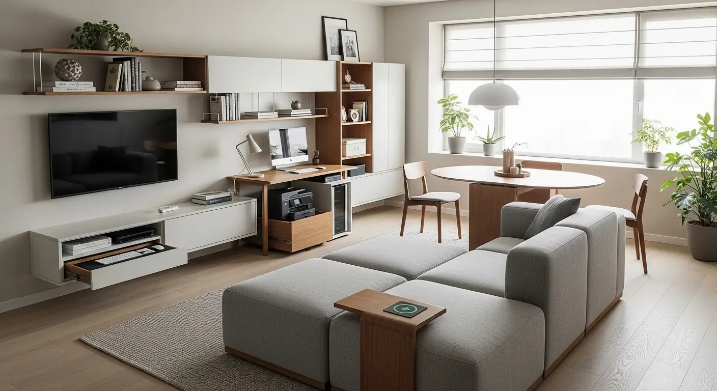 Mecanismos de economia incluem ferragens que ampliam área útil (puxadores embutidos, gavetas de canto com extração total) e painéis dobráveis que transformam sala em escritório. Prefira ferragens com testes de ciclo (50.000+ aberturas) para garantir vida útil.
