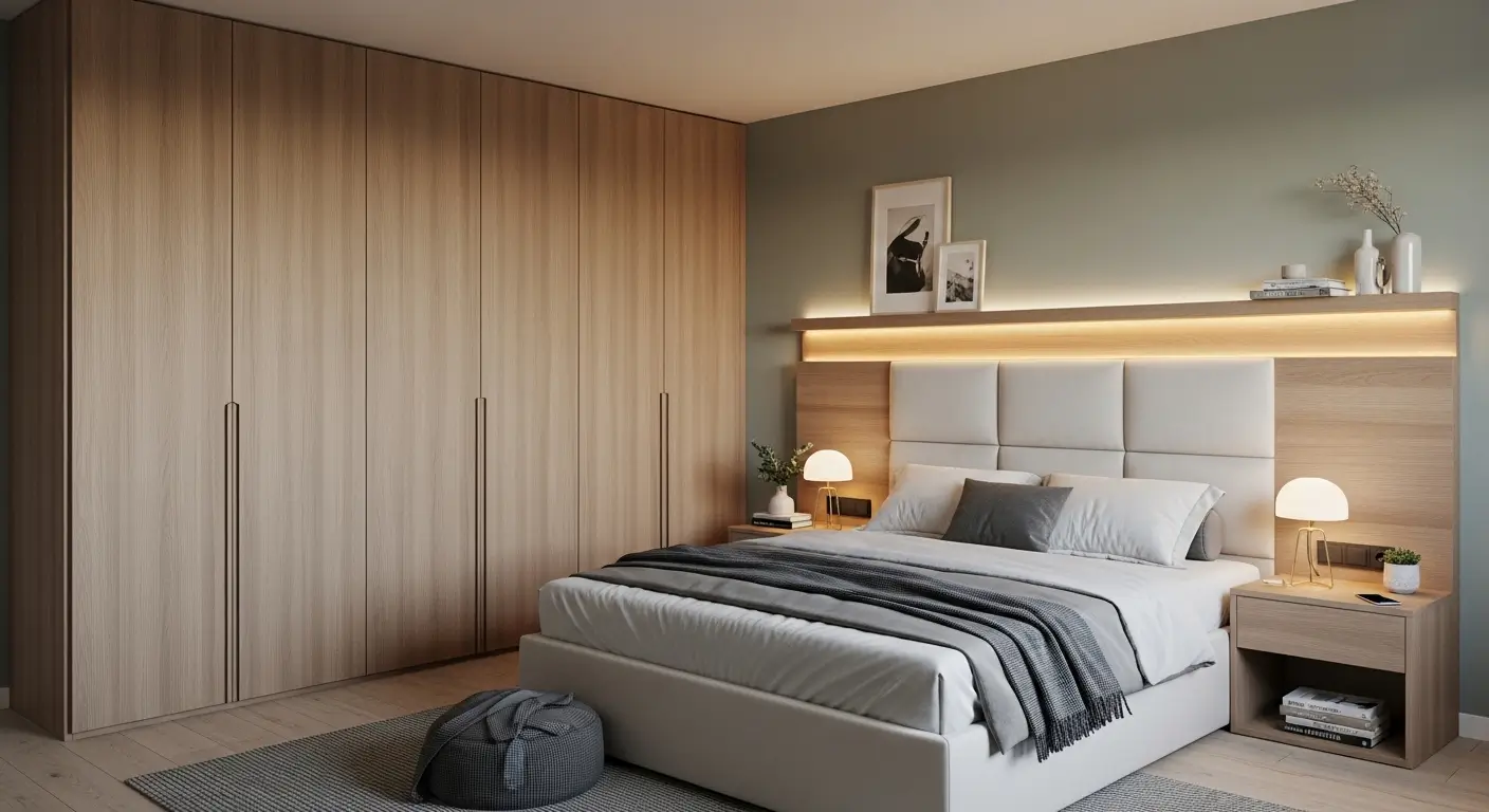 Em vez de criados-mudos soltos, que ocupam espaço e podem cair, a cabeceira pode ter nichos laterais embutidos para apoiar livros, óculos, celular, copo d’água. Cada lado da cama tem seu nicho, na altura ideal.
