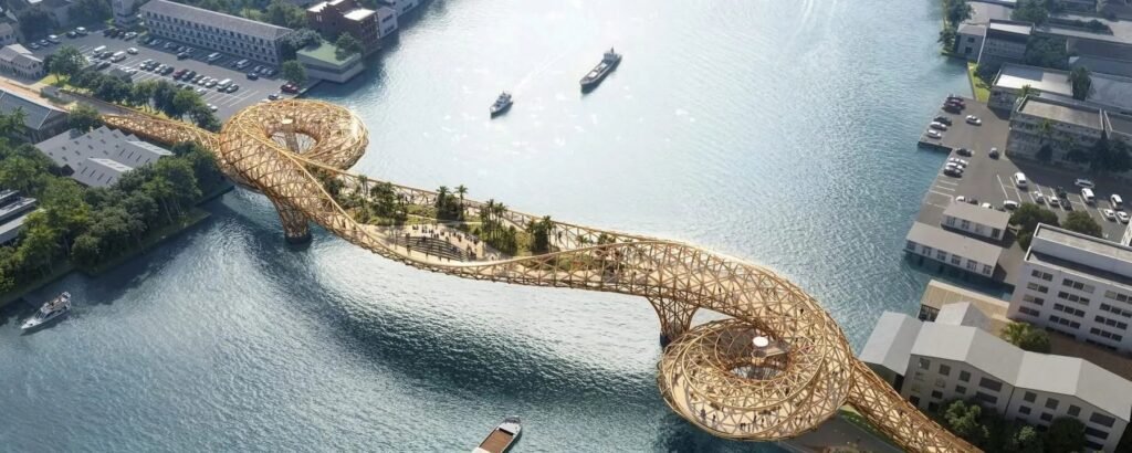 A Administração Metropolitana de Bangkok divulgou imagens de uma nova ponte destinada exclusivamente a pedestres e ciclistas sobre o rio Chao Phraya. A estrutura metálica, em tom dourado, assume forma sinuosa e envolve o percurso como uma renda, criando sombra e permitindo a circulação de vento para amenizar o calor.