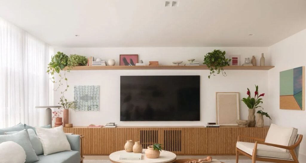 Sala de estar, sala de jantar e home office agora compartilham o mesmo ambiente. A antiga estante foi retirada e substituída por um rack baixo de madeira ripada com uma prateleira única, solução que ampliou visualmente o espaço e reforçou a sensação de leveza. O sofá em “L”, peça afetiva da família, foi restaurado pela Estofaria Urbana e ganhou sarja azul-clara do Espaço Multi, estabelecendo o tom da paleta suave.