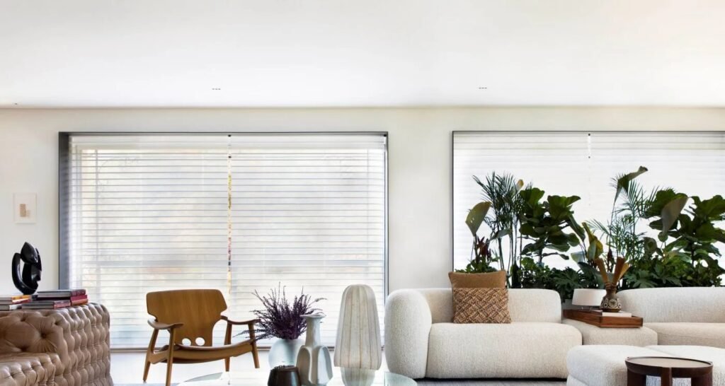 A planta original, considerada bem resolvida, permitiu que as principais intervenções fossem concentradas na área social. O living, antes compartimentado, tornou-se um espaço contínuo, onde pórticos metálicos em tom chumbo emolduram a vista urbana e dialogam com jardineiras cheias de espécies como maranta-charuto, pacová, clúsia, palmeira-chamedórea, guaimbê, costela-de-adão e ficus-lirata.