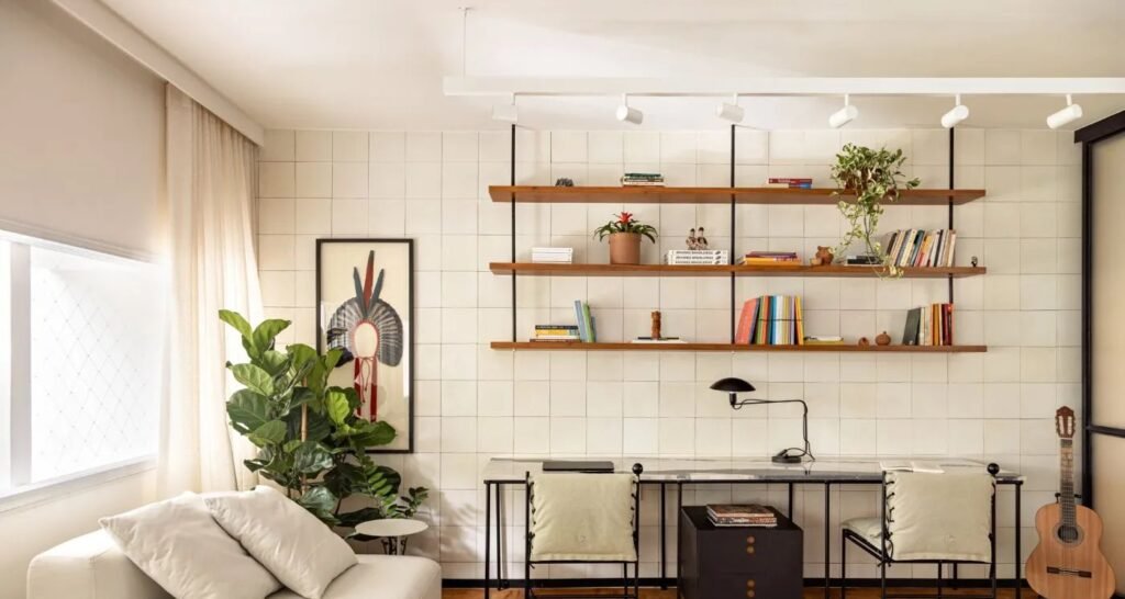 Um apartamento de 122 m² na Asa Sul, em Brasília, passou por reforma completa para atender às necessidades de um casal e seu filho. O projeto é assinado pela arquiteta Gabriella Chiarelli, do escritório Lez Arquitetura, que manteve a estrutura modernista original do edifício e atendeu aos principais pedidos da família: integração de ambientes, destaque para cobogós e criação de banheiro com banheira.
