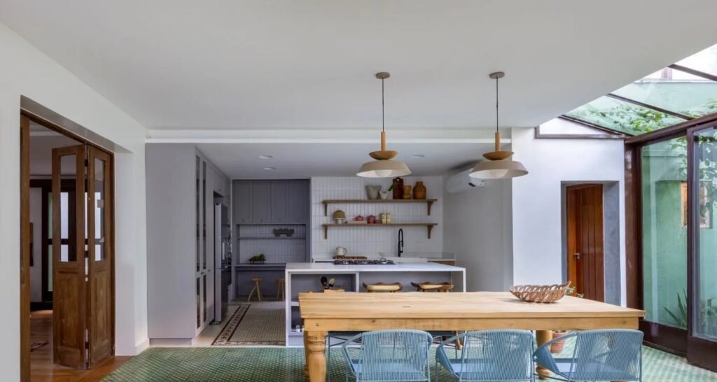 Segundo Patricia Gava, a proposta priorizou madeira natural e soluções autorais de marcenaria para manter a “honestidade construtiva” e evitar acabamentos artificiais. Ladrilhos hidráulicos presentes em vários pontos do imóvel costuram passado e presente, enquanto tons de branco e verde aproximam interior e exterior.