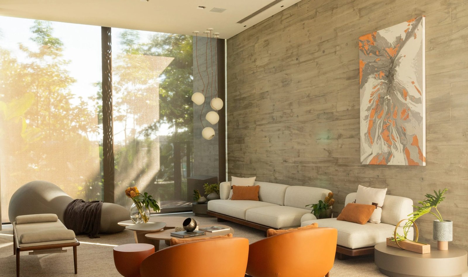 O living conecta-se diretamente à cozinha e à área gourmet por meio da sala de TV; amplos painéis de vidro integram os cômodos à área externa, enquanto portas articuladas permitem juntar ou isolar os espaços conforme a necessidade.