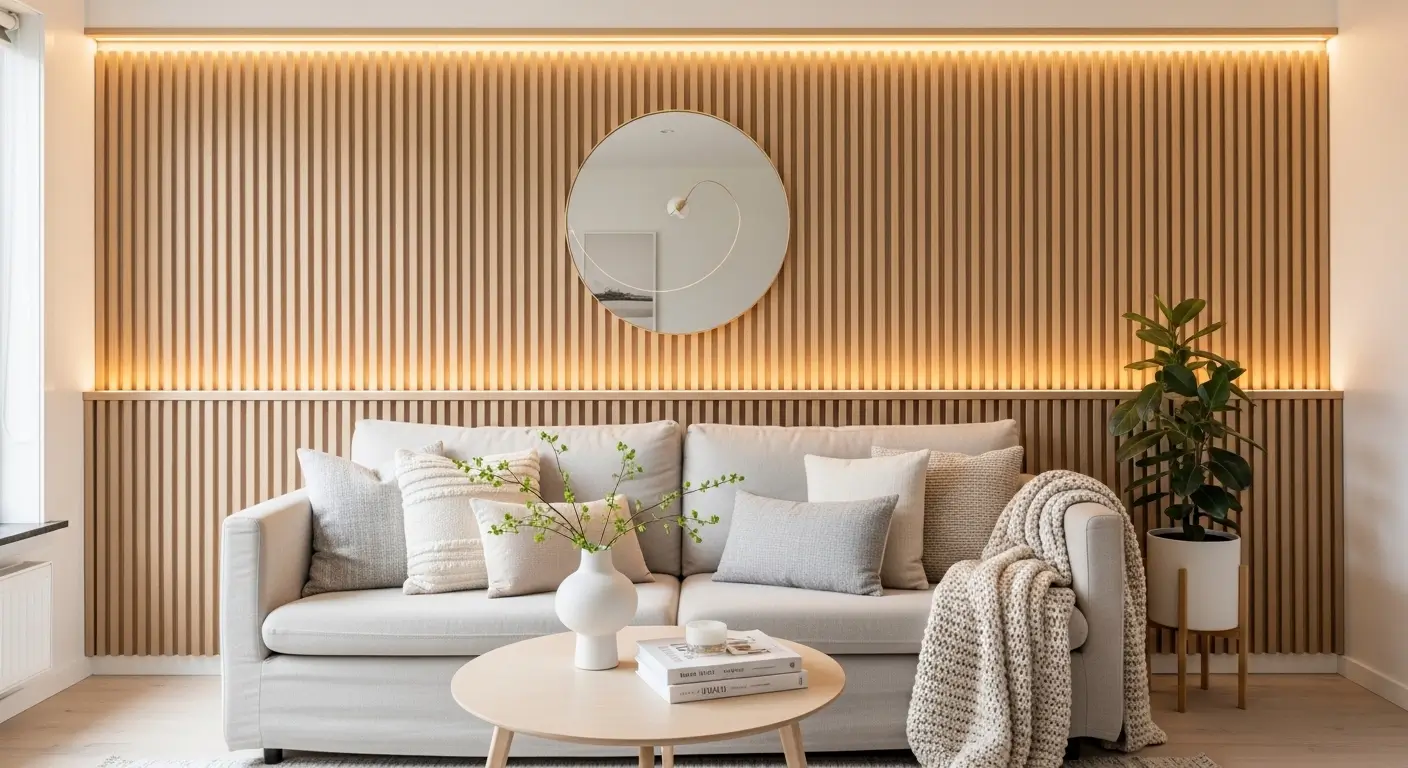 A madeira tem propriedades que absorvem som e regulam a temperatura. Um painel atrás do sofá reduz a reverberação (eco) e traz uma sensação tátil de aconchego que a parede de tinta não oferece.