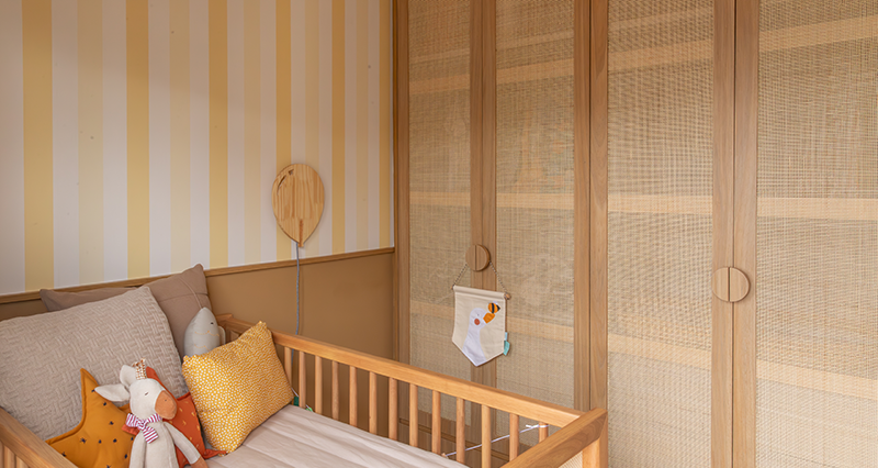 Para criar uma atmosfera acolhedora, foram empregadas texturas como linho, palhinha, tapete com pompons e papel de parede listrado. O conjunto reforça a proposta de um ambiente sensorial e tranquilo, sem recorrer a temas específicos, mas mantendo uma estética capaz de atravessar os anos.